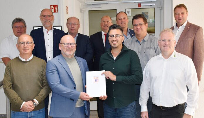 Am Dienstag, 5. Oktober, erfolgte im Landratsamt auf Einladung von Landrat Frank Matiaske die Übergabe des Fördermittelbescheids von Bürgermeister Matthias Horlacher aus Fränkisch-Crumbach an den Geschäftsführer der Odenwald Gigabit Gesellschaft mbH (OGIG), Marius Schwabe.