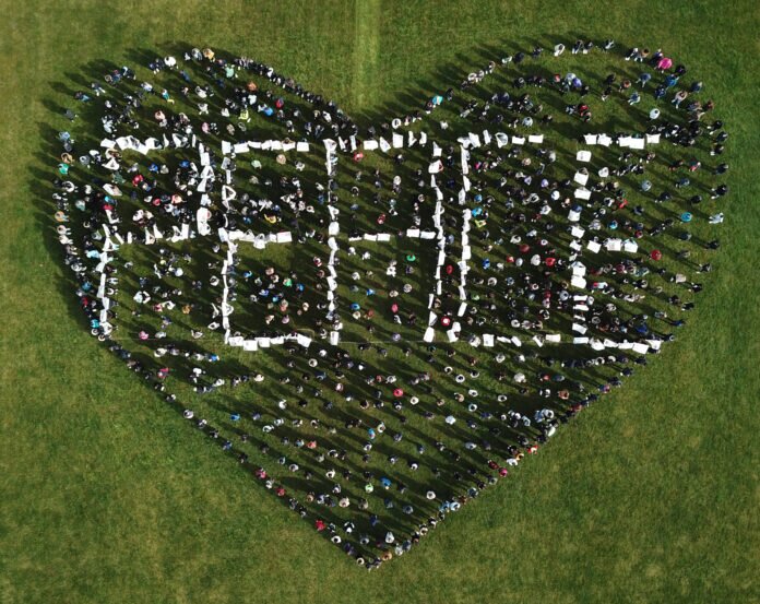 Gemeinsam mit ihren Lehrerinnen und Lehrern bildeten sie einen gigantischen Schriftzug, der den Titel „Peace“ (Frieden) trug und von einem großen Herz eingerahmt wurde.