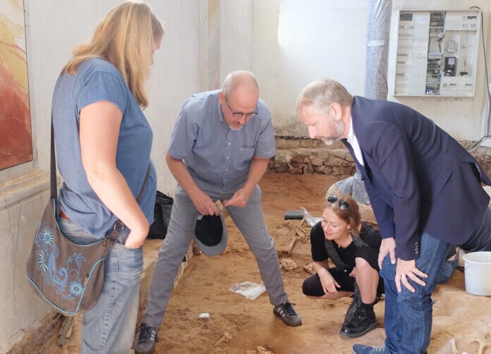 Zu Boden geht der Blick naturgemäß in diesen Tagen in der Lützel-Wiebelsbacher Kirche, wo Skelettfunde Aufschluss über die Geschichte geben (von links: Archäologin Silke Hesemann, Thomas Becker vom Landesamt für Denkmalpflege Hessen, Nicole Braunwarth von der Bauabteilung der Landeskirche und Dekan Carsten Stein).