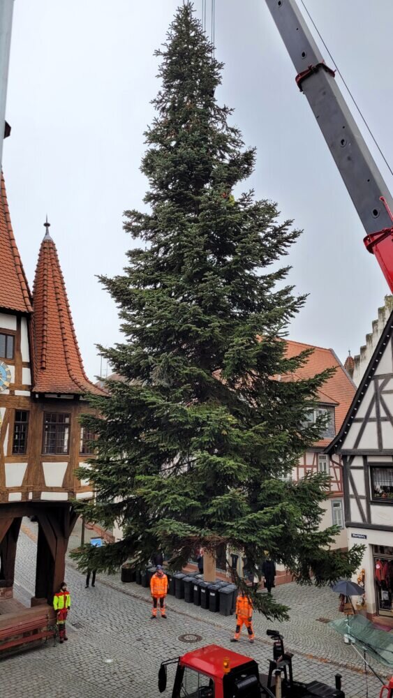 Michelstadt. Der Baum für den Weihnachtsmarkt in Michelstadts Innenstadt ist seit Donnerstagmorgen, 16. November, aufgestellt.