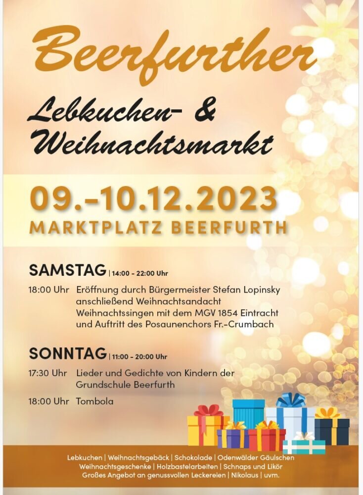 Reichelsheim. In Reichelsheim-Beerfurth findet am Samstag, 9., und Sonntag, 10. Dezember, der Lebkuchenmarkt statt. 18 Marktbestücker sind in diesem Jahr dabei, es werden Lebkuchen, Winzerglühwein, Kaffee und Kuchen, Bratwurst, Schnäpse und weitere Liköre angeboten.