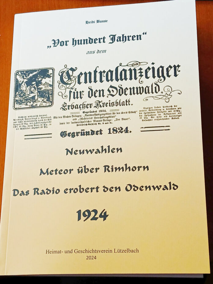 Das Büchelsche „Vor hundert Jahren – aus dem Centralanzeiger 1924“, herausgegeben vom Heimat- und Geschichtsverein Lützelbach, hat 76 Seiten und kann über den örtlichen Buchhandel und über hgv@ourewald.de für sechs Euro bestellt werden. Ebenfalls bestellt werden können noch Restexemplare des Jubiläum-Büchelsche 1924 mit 96 Seiten zum gleichen Preis. red