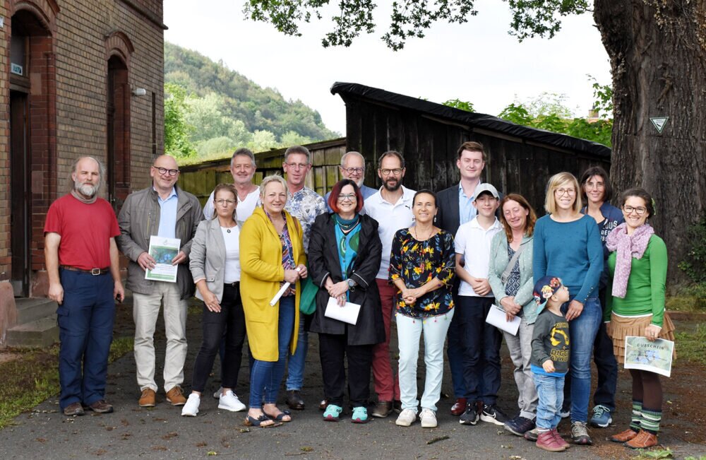 Landrat Frank Matiaske (2. v. l.) und Marvin Donig (Leitung Stabsstelle Landrat, 6. v. r.) dankten den Teilnehmern der diesjährigen Aktion Naturgarten für ihre Bereitschaft, ihre Gärten für die Allgemeinheit zu öffnen und überreichten als Wertschätzung Einkaufs-Gutscheine für Gartenbedarf.