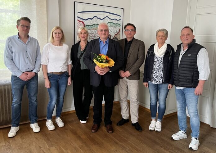 Nach fast 28 Jahren bei der Stadt Michelstadt verabschiedet sich das Veranstaltungs-Urgestein in die Altersteilzeit. Bürgermeister Dr. Tobias Robischon, Hauptamtsleiter Matthias Nowak, Kulturamtsleiter Heinz Seitz, Personalratsvertreterin Sandra Reubold und seinen Kolleginnen aus dem Kulturamt Natalie Dengler und Sabine Schuhmann verabschiedeten Engelter.