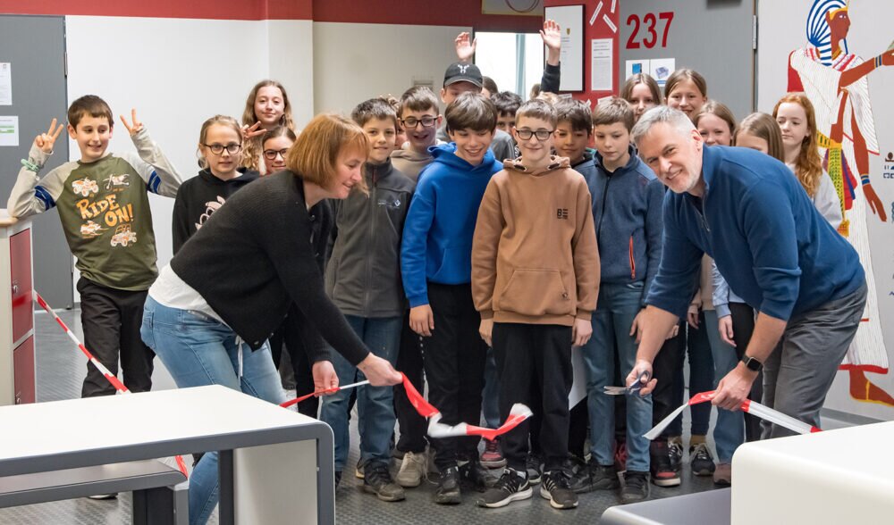 Reichelsheim. Vor Kurzem wurden neue Möbel auf den Fluren von Schulleiter Herwig Bendl und Oberstudienrätin Kirsten Berg freigegeben. Direkt nach dem symbolischen Durchtrennen des rot-weißen Absperrbands wurden erste Sitzproben an den Arbeitsplätzen gemacht.