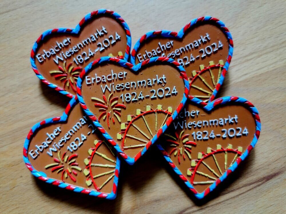 Das Motiv steht nun im Zeichen des Jubiläums „200 Jahre Wiesenmarkt in Erbach“ und zeigt die Jahre 1824-2024, mit dem Riesenrad und Feuerwerk zwei Wahrzeichen des Festes. Das Herz wurde von Marktmeister Peter Breidenbach gestaltet.