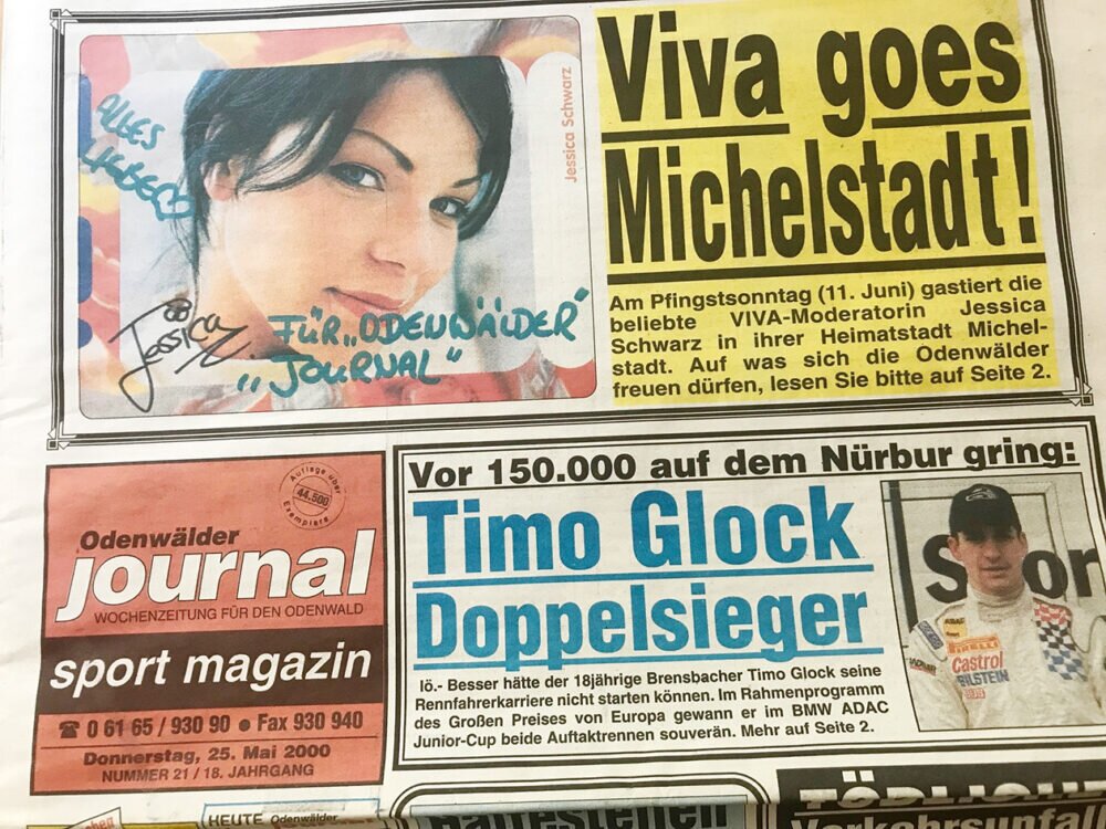 Nicht minder ein Zeitensprung ist der 2. „Aufmacher“ der besagten betagten Ausgabe des Journals vom 25. Mai 2000: „18jähriger Timo Glock Doppelsieger“ beim BMW ADAC Junior Cup . Zwei Odenwälder Newcomer, die später eine Weltkarriere hinlegen sollten.