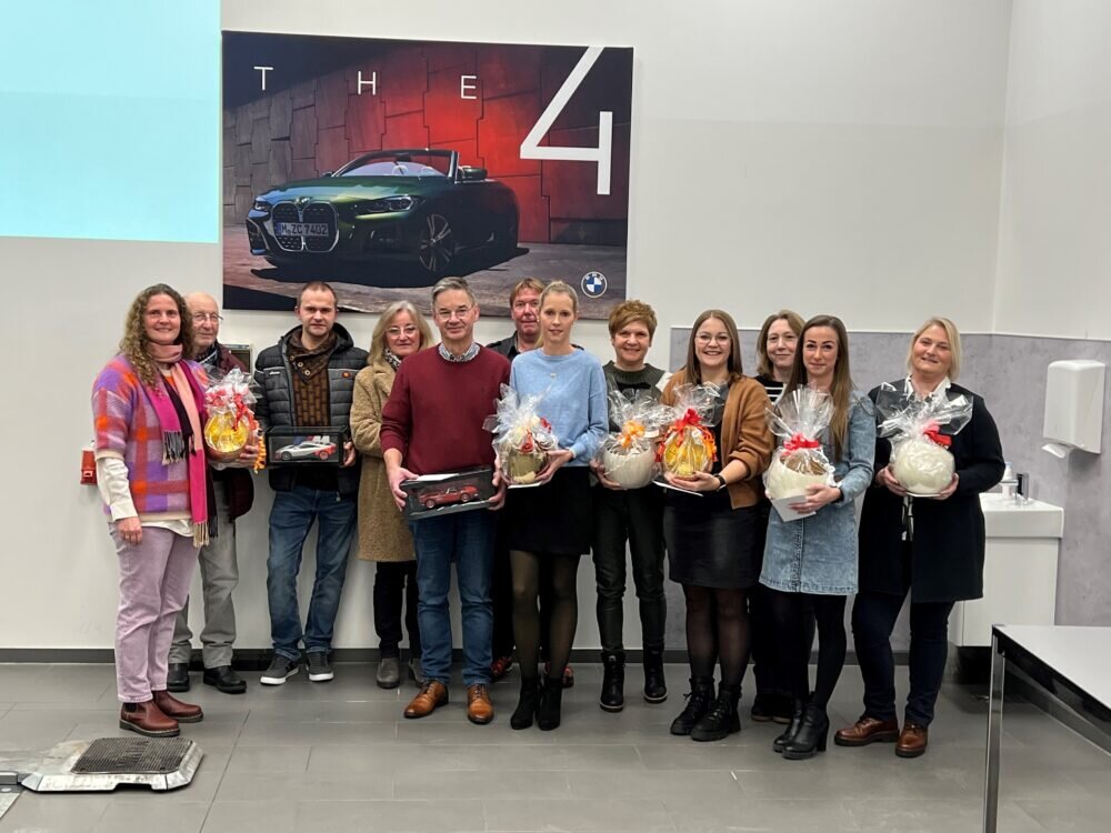 Nach zwei Jahren ohne Mitarbeiterehrungen konnten nun zahlreiche Mitarbeiter für langjährige Treue zum Unternehmen geehrt werden. Drei Mitarbeiterinnen und ein Mitarbeiter – Bianca Schepelenko, Sophia Neuhäuser, Katharina Hein und Christian Rux – sind seit zehn Jahren bei BMW Müller beschäftigt. Christian Rux konnte leider aufgrund von Krankheit nicht bei der Ehrung mit dabei sein. Weitere vier Mitarbeiterinnen und Mitarbeiter – Jenny Keilbach, Siegbert Flicker, Helga Keller und Alexander Horlebein – wurden für 15 Jahre Betriebszugehörigkeit geehrt.