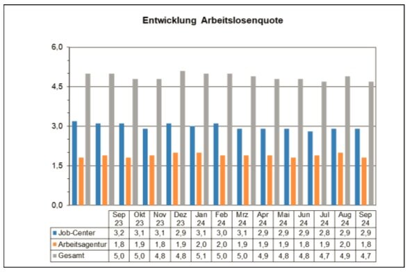 Odenwaldkreis. Im Odenwaldkreis hat sich die Zahl der arbeitslos gemeldeten Bürger im September von 2.564 auf 2.486 reduziert; die Arbeitslosenquote ist im Vergleich zum Vormonat um 0,2 Punkte auf 4,7 Prozent zurückgegangen.