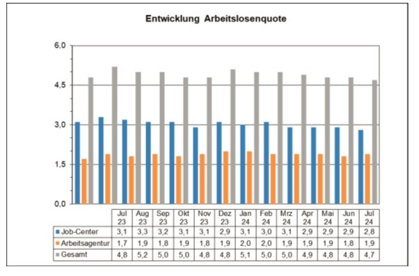 Odenwaldkreis. Im Odenwaldkreis ist die Zahl der arbeitslos gemeldeten Bürger im Juli 2024 von 2.497 auf 2.492 weiter zurückgegangen – die Arbeitslosenquote sinkt auf 4,7 Prozent.
