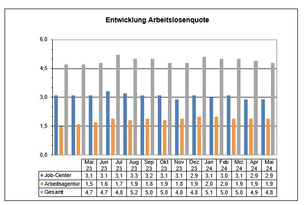 Odenwaldkreis. Im Odenwaldkreis ist die Zahl der arbeitslos gemeldeten Bürger im Mai von 2.539 auf 2.535 weiter leicht zurückgegangen – die Arbeitslosenquote sinkt auf 4,8 Prozent.