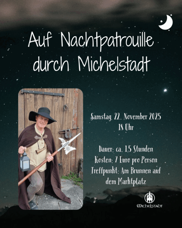 Ausgestattet mit Hellebarde und Laterne erzählt der Nachtwächter bei der Führung Geschichten und Anekdoten aus Jahrhunderten Michelstädter Stadtgeschichte. Der Rundgang führt durch enge Gassen und vorbei an Fachwerkfassaden, die im Schein der Laterne eine besondere Atmosphäre entfalten.