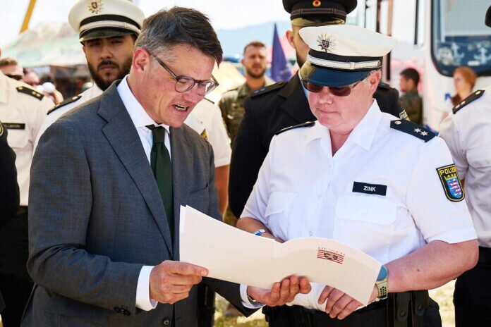 Wiesbaden/Pfungstadt. Hessens Ministerpräsident Boris Rhein hat auf dem Hessentag in Pfungstadt Angehörige der hessischen Polizei, der Bundespolizei, der Justiz, der Bundeswehr, der US-Armee sowie einen Zivilisten für besonderes Engagement geehrt.