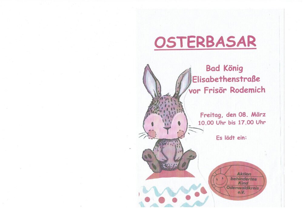 Bad König. Am Freitag, 8. März, findet von 10 bis 17 Uhr in der Elisabethenstraße vor Friseur Rodemich ein Osterbasar der “Aktion behindertes Kind Odenwaldkreis” statt.