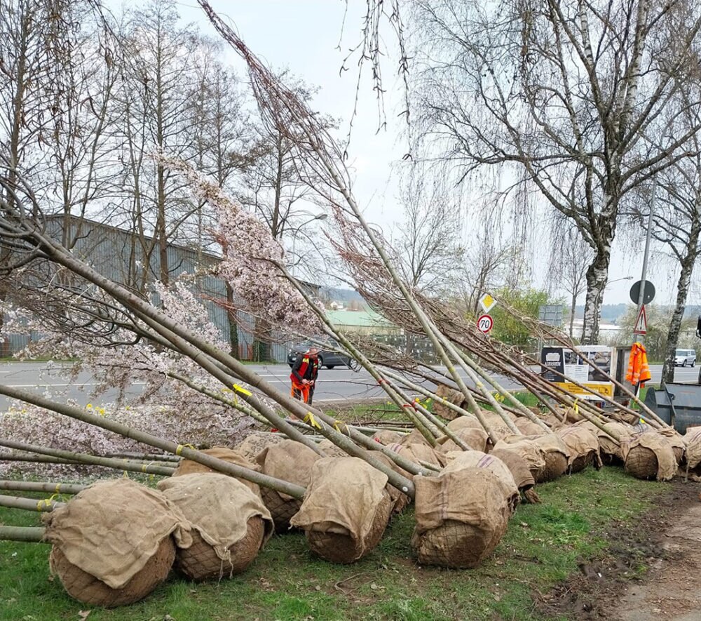 Die Birken sind nach und nach abgestorben und mussten größtenteils gefällt werden. An ihrer Stelle werden 64 neue Straßenbäume gesetzt, davon 30 großkronige Bäume wie Ahorn, Linde und Spitzahorn sowie 34 kleinkronige Zierkirschen in den Blütenfarben weiß und rosa.