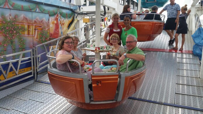 Die Teilnehmenden können sich auf die Fahrt mit dem neuen Riesenrad der Firma Willenborg in 45 Metern Höhe freuen. Die Gondeln des Riesenrads sind geschlossen und bieten sechs Personen auf zwei gegenüberliegenden Bänken auch bei schlechtem Wetter den nötigen Schutz. Das Frühstücksgeschirr, auf dem das Frühstück serviert wird, ist dank der Unterstützung der Firma KOZIOL nachhaltig und kann wiederverwendet werden. Von der „Bodenstation“ aus werden während der Fahrt Getränke und Speisen nachgereicht.