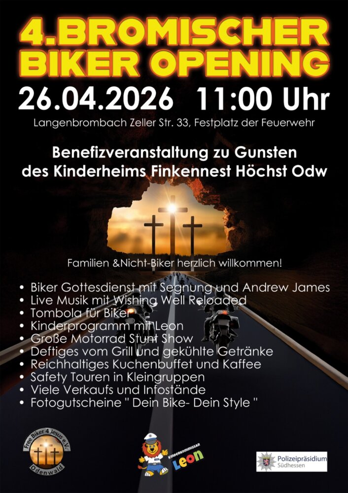 Brombachtal-Langenbrombach. Zum 4. Bromischen Biker Opening wird am Sonntag, 26. April, auf den Festplatz der Feuerwehr in der Zeller Straße 33 eingeladen. Beginn der Benefizveranstaltung ist um 11 Uhr.