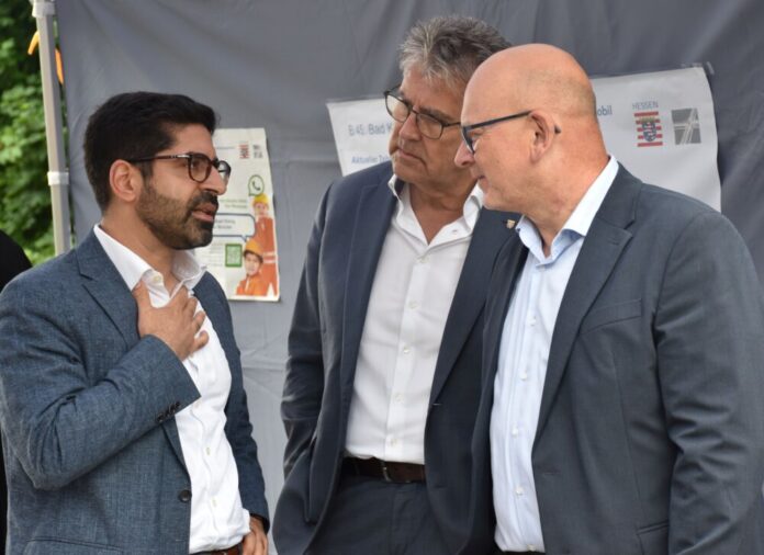 Bad König. Ein Zeitpunkt für den Abriss der „Zeller Brücke, die seit dem 29. April wegen schweren Mängeln für den Verkehr gesperrt werden nannten der Hessische Wirtschafts- und Verkehrsminister Kaweh Mansoori und Heiko Durth, Präsident von Hessen mobil, bei einem Vor-Ort-Termin am Mittwoch, 4. Juni. Bis zum Ende der Sommerferien sollen so zumindest die Züge der Odenwald-Bahn wieder regulär fahren können.