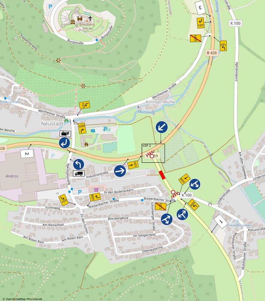 Die Umleitung in Richtung B426 verläuftüber die „Breitenbacher Straße“, „Bahnhofsstraße“ und „Wertheimer Straße“ bis zur B426 und umgekehrt.