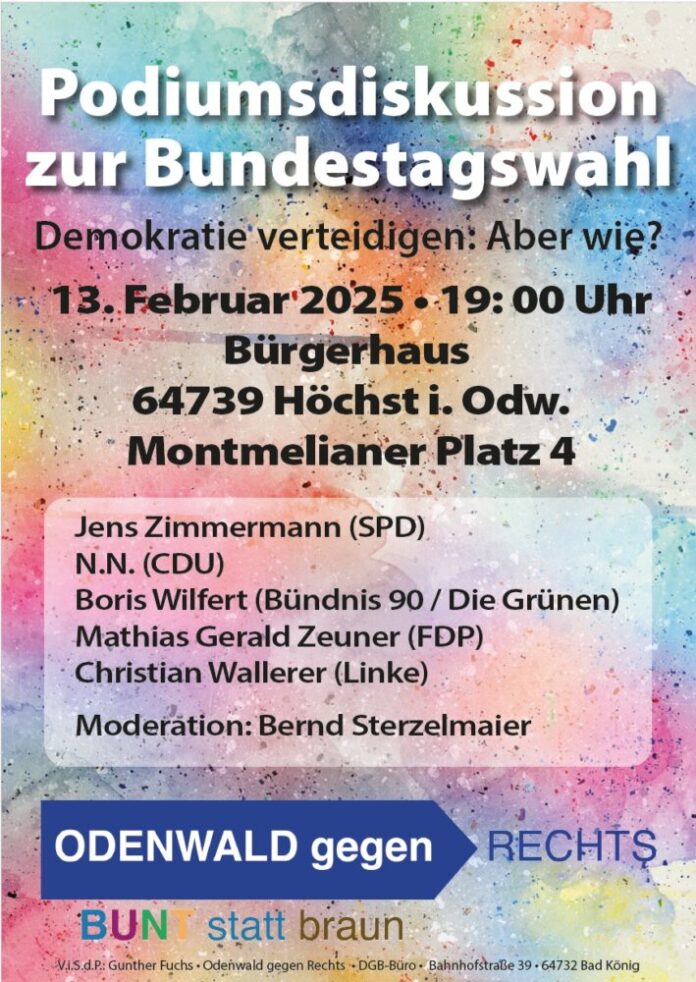 Michelstadt/Höchst. Das Bündnis “Odenwald gegen rechts – Bunt statt braun” lädt zu einer Podiumsdiskussion am Donnerstag, 13. Februar, um 19 Uhr in das Bürgerhaus in Höchst ein.