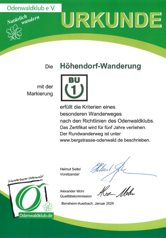 Erbach. Der beliebte Rundwanderweg „Höhendorf-Wanderung Bu1“ rund um den Erbacher Höhenort Bullau darf sich erneut mit dem Qualitätssiegel „Wanderbarer Odenwald“ schmücken. Der 14 Kilometer lange Weg, der seit 2014 vom Odenwaldklub e. V. zertifiziert ist, wurde im Auftrag der Stadt Erbach nachzertifiziert und erfüllt weiterhin alle Kriterien eines besonderen Wanderwegs.