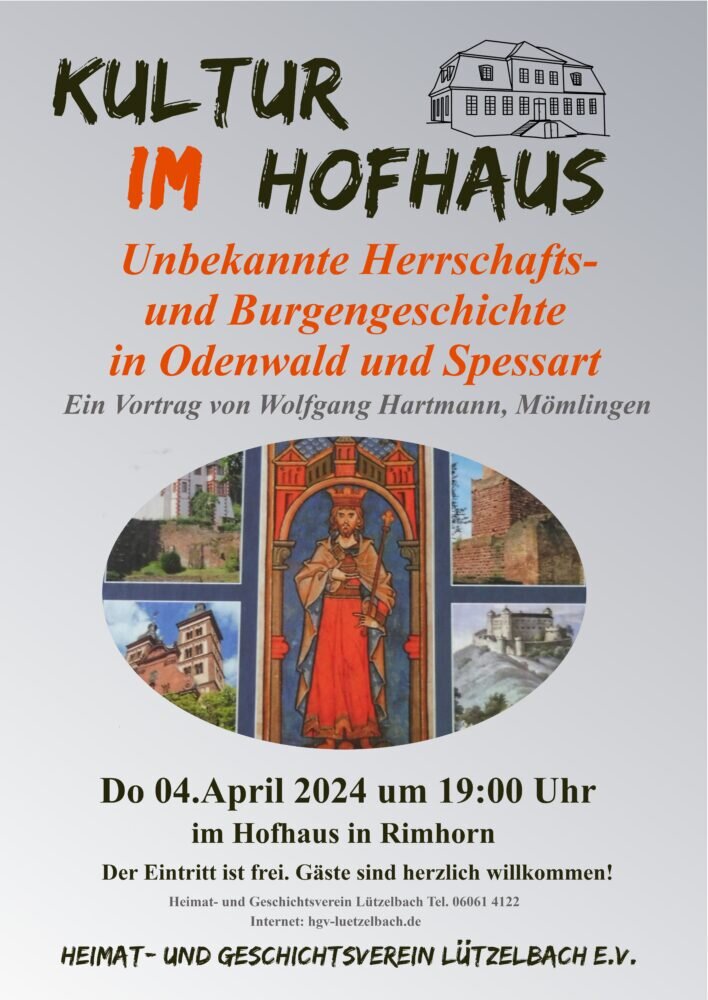 Lützelbach. Unbekannte Burgengeschichte im Odenwald und Spessart ist das Thema des nächsten Vortrags des Heimat- und Geschichtsvereins Lützelbach in der Reihe „Kultur im Hofhaus“ am Donnerstag, 4. April, um 19 Uhr im Hofhauskeller in Lützelbach-Rimhorn, Rathausstraße 29.