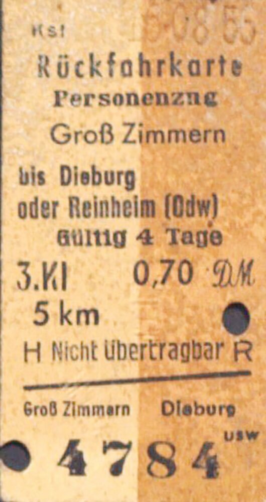 1956 kostete eine Rückfahrkarte von Groß-Zimmern nach Dieburg oder Reinheim 70 Pfennig. Heute kostet der Nachdruck dieser Fahrkarte 10 Euro und ist die Eintrittskarte zu der Veranstaltung am Samstag, 17. September, um 19.30 Uhr im Kulturzentrum Glöckelchen, mit der an die Geschichte des Groß-Zimmerner Bahnhofs erinnert wird.