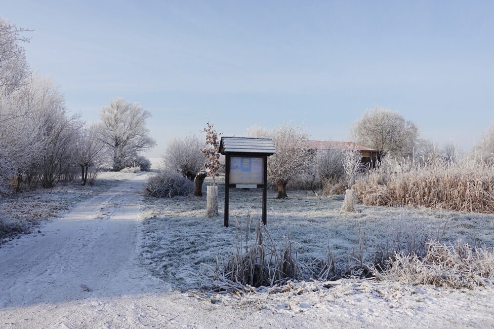 Vom Parkplatz mit dem Schild “Kläranlage” aus sind es acht Minuten zu Fuß über den ausgeschilderten Weg zur Naturschutzscheune.