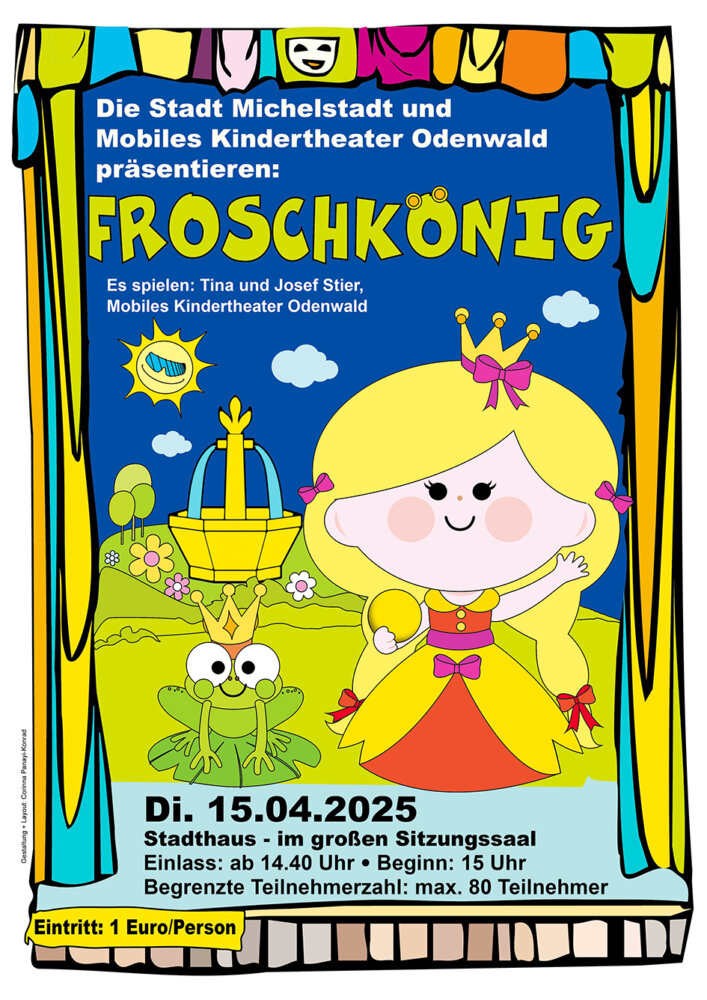 Michelstadt. Die Stadt Michelstadt und das Mobile Kindertheater Odenwald laden am Dienstag, 15. April, zur Theateraufführung “Froschkönig” ins Stadthaus, Frankfurter Str. 3, ein.