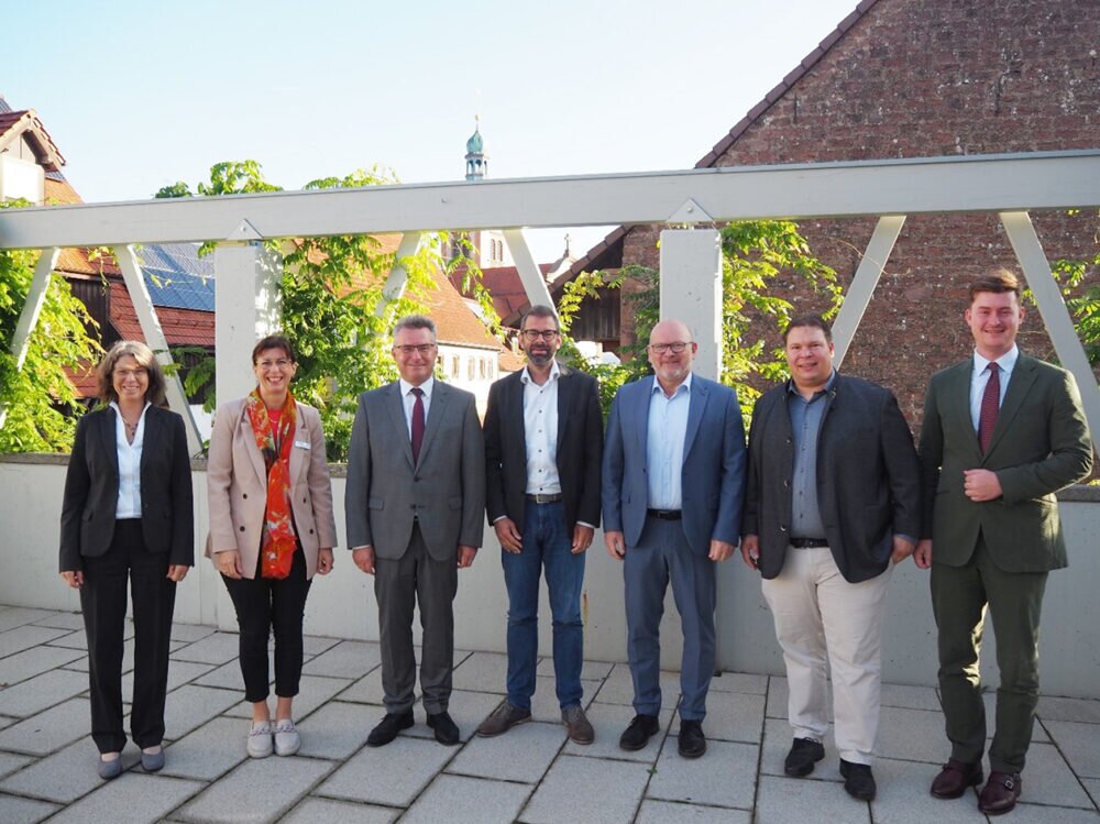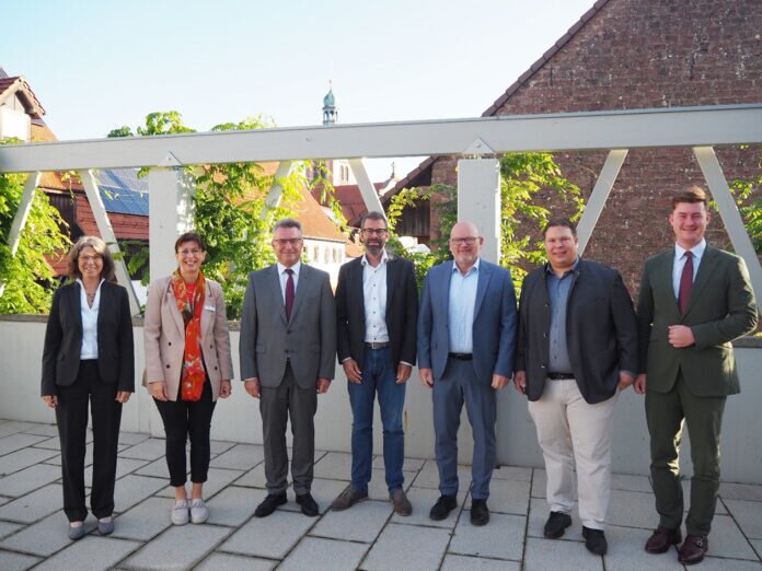 Drei-Landräte-Treffen in Waldbrunn. V.l.n.r.: Susanne Seidel (Landkreis Miltenberg), Marion Günther und Landrat Dr. Achim Brötel (Neckar-Odenwald-Kreis), Jens Marco Scherf (Landkreis Miltenberg), Landrat Frank Matiaske (Odenwaldkreis), Bürgermeister Markus Haas, Marvin Donig (Odenwaldkreis). Foto: Landratsamt Neckar-Odenwald-Kreis
