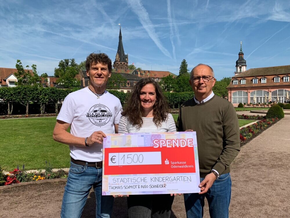 Marktmeister Peter Breidenbach übergab in Vertretung für die beiden Beschicker einen Scheck im Wert von 1.500 Euro an Larissa Leiter, verantwortlich für den Wiesenmarkt bei der Stadt Erbach, und Bürgermeister Dr. Peter Traub.