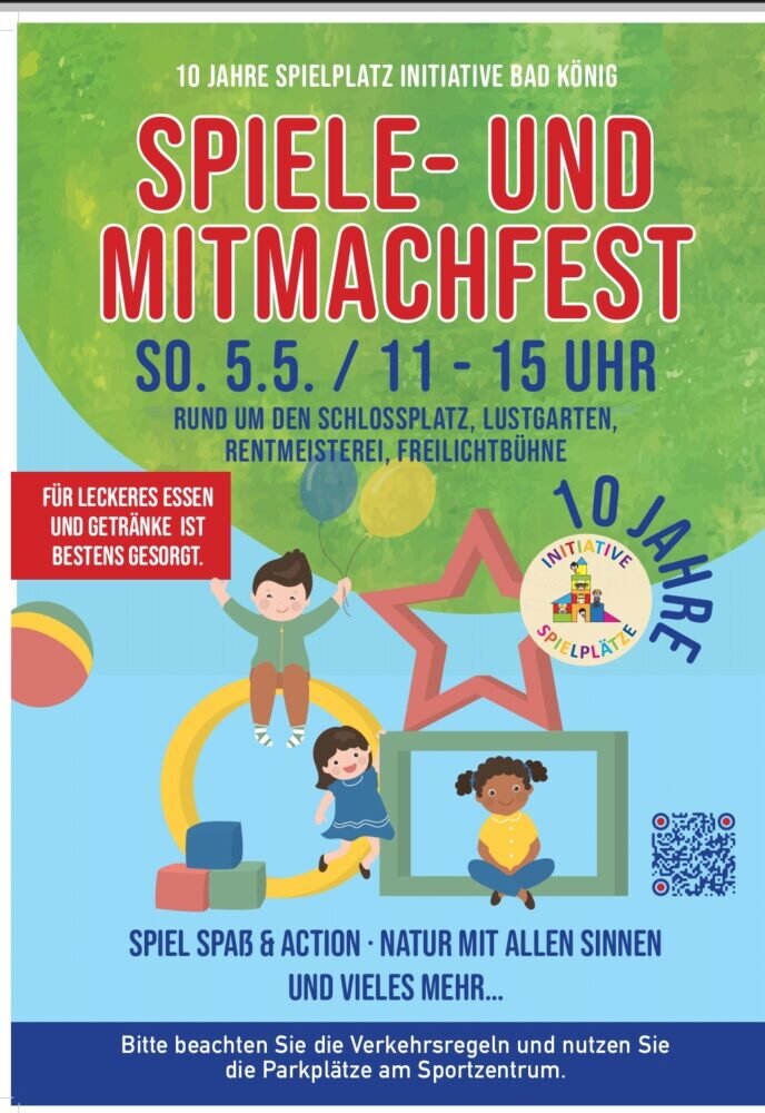 Bad König. Die Spielplatzinitiative Bad König wird zehn Jahre alt und feiert am Sonntag, 5. Mai, mit einem Spiele- und Mitmachfest von 11 Uhr bis 15 Uhr in der Bad Königer Altstadt.