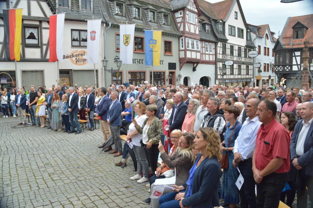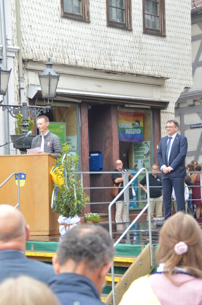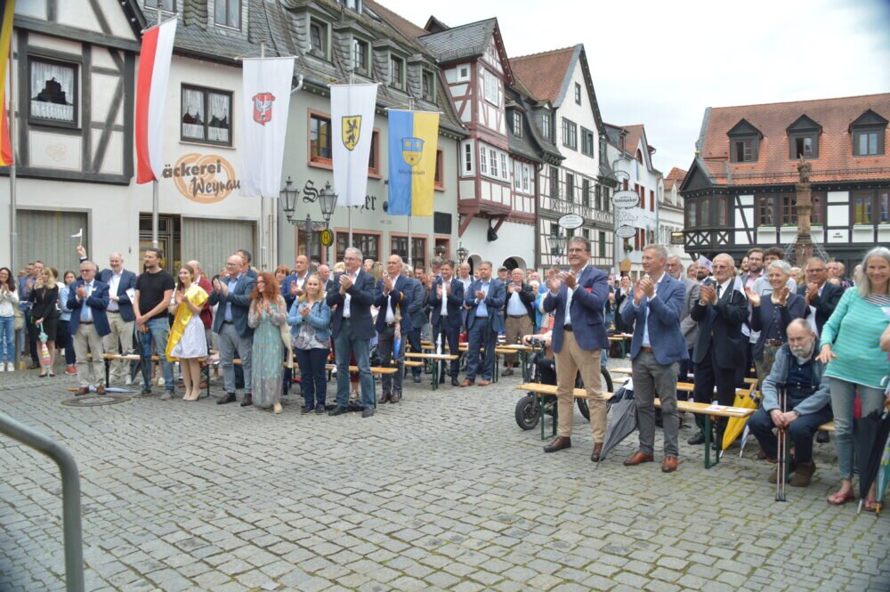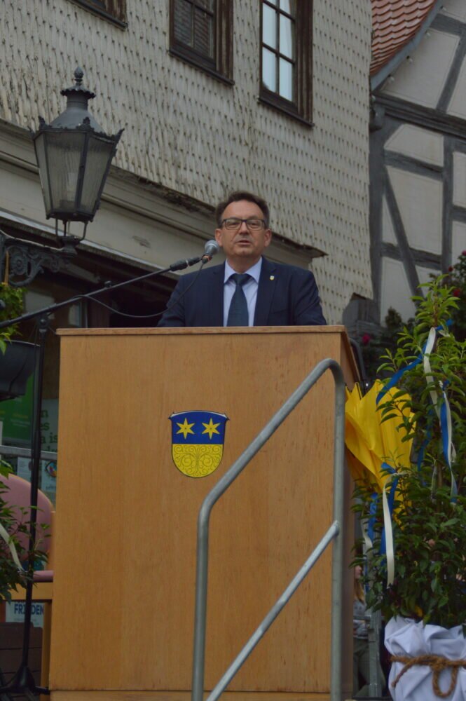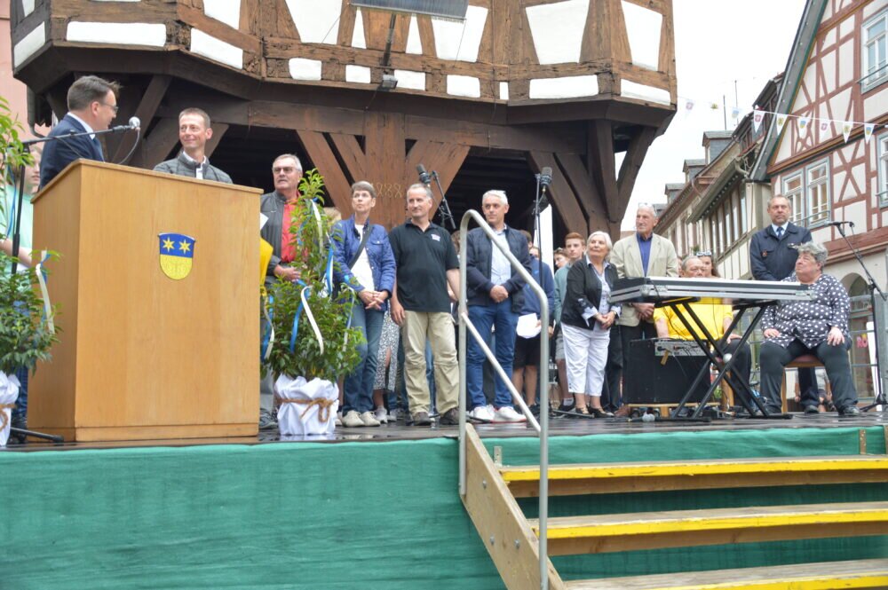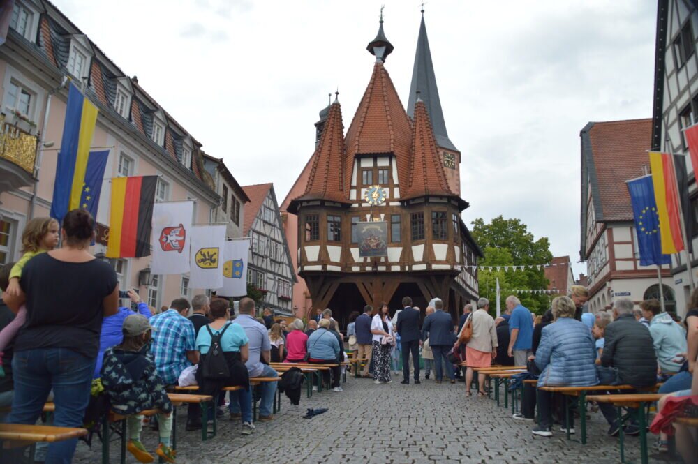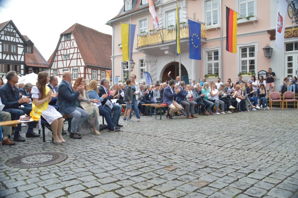Michelstadt Bürgermeister Dr. Tobias Robischon dankte zu Beginn allen Beteiligten für die Zuversicht und das Vertrauen. „Es ist ein Fest für alle“, bewegten seine Worte. Auch betonte Robischon, dass in diesem Jahr die Michelstädter Farben blau-gelb Solidarität mit der Ukraine symbolisieren sollen.