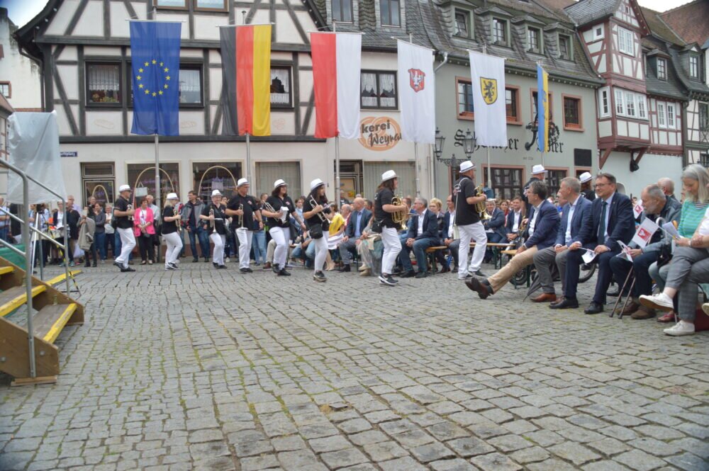 Während der Festansprache wurde auch sehr schnell deutlich, dass es in diesem Jahr nicht nur um den Bienenmarkt, sondern auch um „Freundschaft“ geht. Städtefreundschaften, um es genauer zu beschreiben. Hiebei berief sich der Rathauschef auf die Städtepartnerschaften zwischen Rumilly (Frankreich) und Hulst (Holland), die auch eine entscheidende Rolle bei der Eröffnungsfeier des Bienenmarktes mit sich brachten. So wiesen etwa Gäste aus dem niederländischen Hulst mit ihrer Kapelle „Bierkaal Brass“ der Veranstaltung ihre Ehre auf. Insbesondere wurde aber auf die 50 Jahre währende Partnerschaft mit dem französischen Rumilly hingewiesen. Die französische Stadt entsandte eine große Delegation in den Odenwald, um nicht nur an der Eröffnungsfeier teilnehmen, sondern auch wieder auf dem traditionellen Volksfest einen Stand zu betreiben.