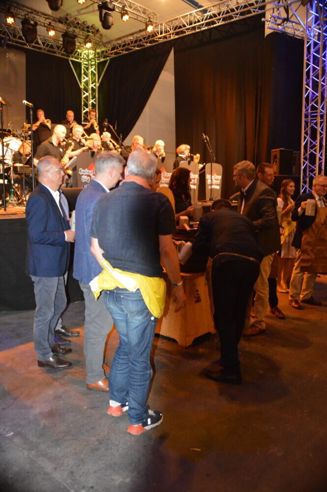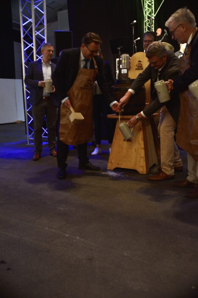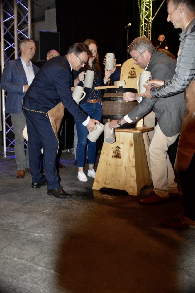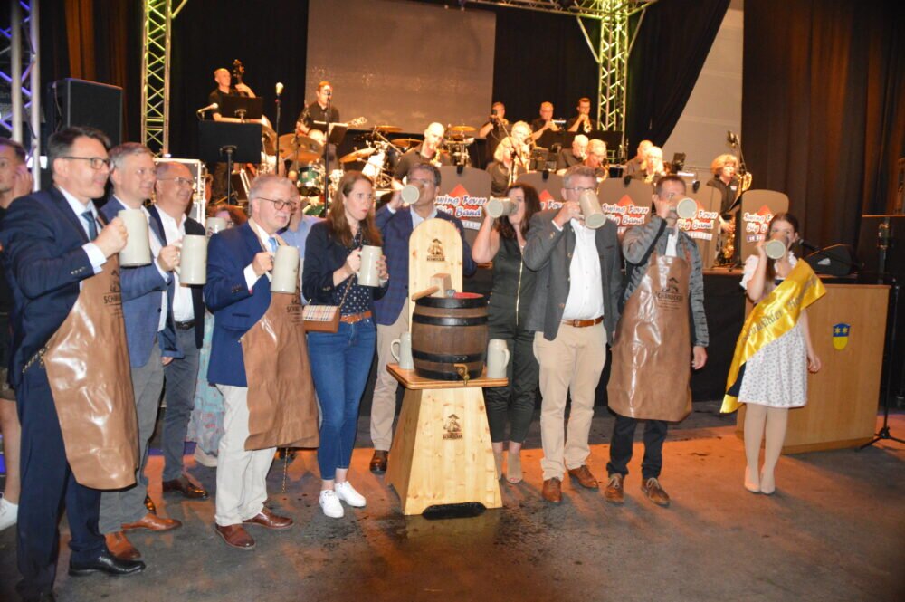 Nach der rund einstündigen Veranstaltung auf dem Rathausplatz und den Worten Robischons: „Der Bienenmarkt 2022 ist eröffnet“, marschierten die Anwesenden – geführt von einem großen Bienenstock und der „Show & Marchingband Happy Sound“ aus Michelstadt – zum Marktgelände. Hier wartete ein großes Tor, entworfen nach einer Zeichnung von Johanna Fink (Schülerin der Stadtschule Michelstadt), auf das symbolische Durchschneiden des Eröffnungsbandes. Danach ging es einmal über den Bienenmarkt – vorbei an allerlei Leckereien, Fahrgeschäften und Verkaufsständen – in die Erwin-Hasenzahl-Halle, in der der Michelstädter Bürgermeister den traditionelle Bieranstich vollziehen durfte. Unter Aufsicht einer Jury gelang Robischon der Anstich bereits beim ersten Schlag. „Es läuft“, war zu hören. Nachdem alle Jurymitglieder ihren Maßkrug unter den Zapfhahn gehalten, das „Mossautaler Festgetränk“ getestet haben und es allen Vorkostern „noch gut ging“, verkündigte der der Rathauschef aus Michelstadt erfreut: „Sie können nun ruhigen Gewissens das Festgetränk genießen. Zum Wohl!“ Clarissa Yigit