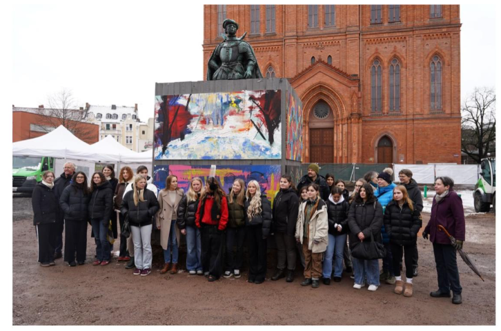 Die bemalten Tafeln schmücken nun den drei Meter hohen Holzzaun, der das Denkmal während der Bauarbeiten auf dem Schlossplatz schützt. Dort laufen derzeit umfangreiche Umgestaltungsmaßnahmen. Unter anderem werden Natursteinpflaster verlegt, 24 Bäume gepflanzt, Zisternen zur Regenwassernutzung eingebaut und neue Versorgungsanschlüsse für Veranstaltungen geschaffen.
