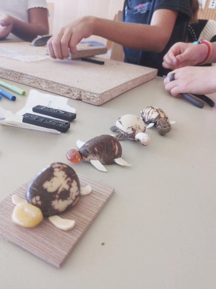 Unter Anleitung der Elfenbeinschnitzerin Pauline Meyer und des Elfenbeinschnitzermeisters Luis Corrigan entstanden aus Mammutelfenbein, Bernstein, Rinderknochen, Geweih und Horn individuelle Arbeiten, die mit Feilen, Schleifpapier, Fräswerkzeugen und Poliermaschinen veredelt wurden.