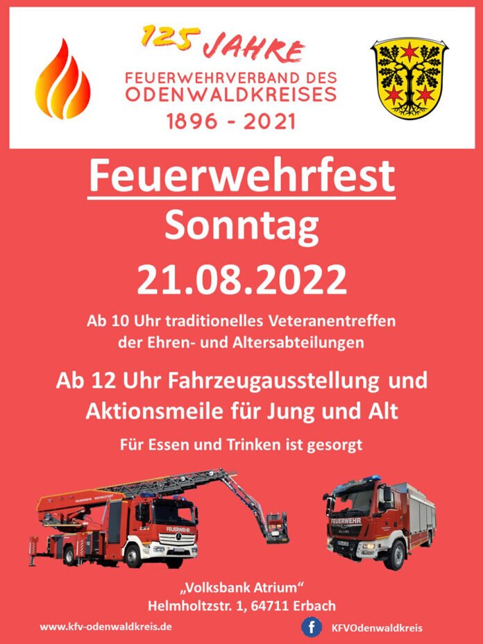 Der Feuerwehrverband des Odenwaldkreises lädt zum Feuerwehrfest anlässlich des 125jährigen Bestehens in das Atrium der Volksbank Erbach am Sonntag, 21. August ein.