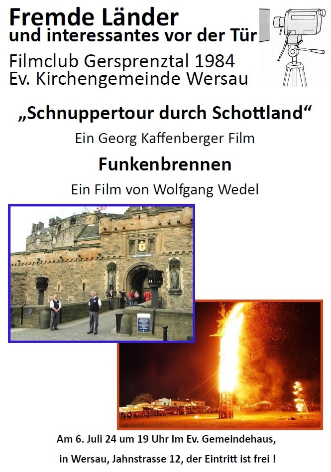Zum einen wird der Georg-Kaffenberger-Film “Schnuppertour durch Schottland” gezeigt, als zweites steht “Funkenbrennen”, ein Film von Wolfgang Wedel, auf dem Programm.