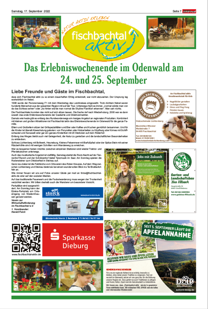 Start Veranstaltungen Fischbachtal aktiv - Anzeige - Veranstaltungen Fischbachtal aktiv Von Sven Iwertowski - 16. September 2022 1067 PDF: hier klicken Fischbachtal aktiv PDF: hier klicken Fischbachtal aktiv Programm - Anzeige - Verwandte ArtikelMehr vom Autor Flohmarkt im Herbst Senioren treffen sich Wandern durch die Geschichte Kommentieren Sie den Artikel Antwort abbrechen Bitte geben Sie Ihren Kommentar ein! Bitte geben Sie hier Ihren Namen ein Sie haben eine falsche E-Mail-Adresse eingegeben! Bitte geben Sie hier Ihre E-Mail-Adresse ein E-Mail und Name für die Zukunft merken Lützelbach Bedeckt enter location -0.2 ° C -0.2 ° -0.6 ° 92 % 1.3kmh 100 % Fr. 3 ° Sa. 6 ° So. 9 ° Mo. 11 ° Di. 10 °