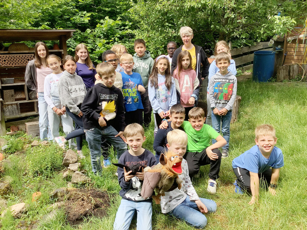 Die Weibelfeldschüler arbeiteten vor Ort mit je drei Zweitklässlern der Reichenberg-Schule zusammen, um die einzelnen Holzplatten einer Wildbienennisthilfe genau unter die Lupe zu nehmen.