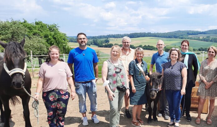Madeline Müller, qualifizierte und zertifizierte Reittherapeutin, und ihr Team unterstützen die Kinder bei verschiedenen Aufgaben, die zum Alltag auf einem Pferdehof gehören, wie beispielsweise das Misten und das Stopfen von Heunetzen.