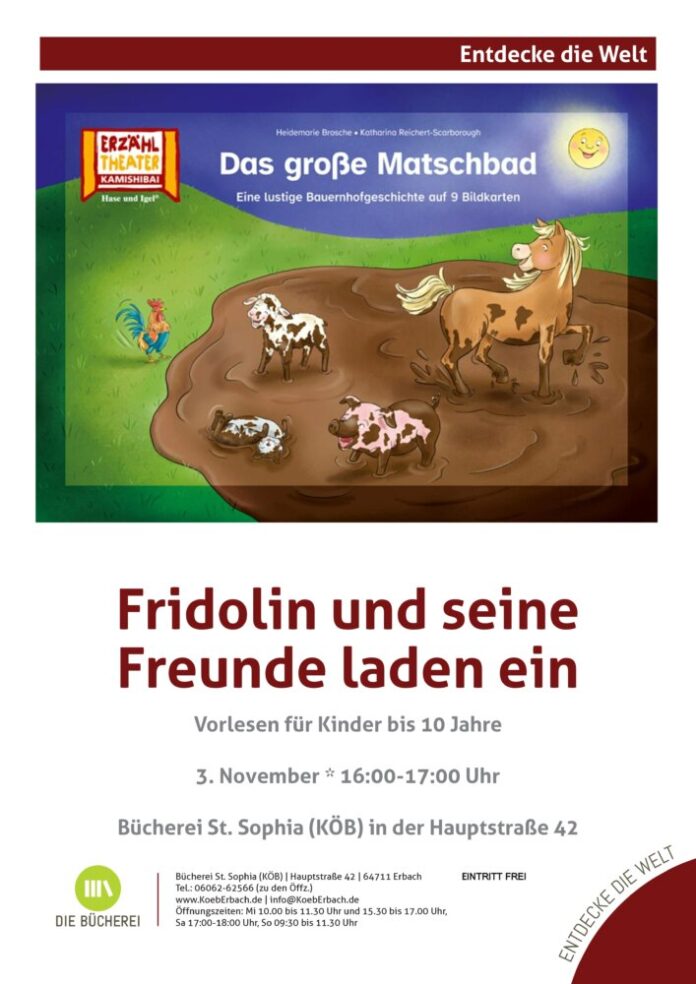 Erbach. Die Bücherei St. Sophia lädt am Montag, 3. November, zur Vorlesestunde ein. Um 16 Uhr erwarten Kindergartenkinder und Kinder bis 8 Jahre Geschichten und das Kamishibai-Vorlesetheater „Das große Matschbad“. Die Veranstaltung in der Hauptstraße 42 ist kostenlos. Weitere Informationen gibt es unter www.KoebErbach.de. red