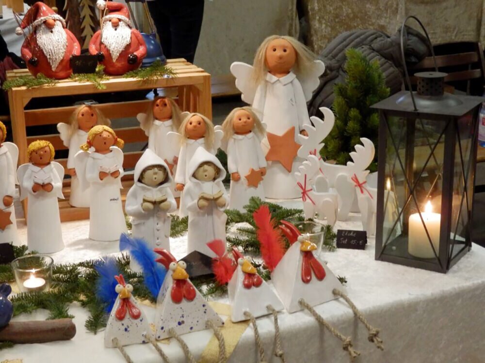 Angeboten werden Aquarell-, Seiden- und Bauernmalerei, Drechselarbeiten, Schnitzereien, Glasbläserarbeiten, Häkelarbeiten, Keramik, Klöppelarbeiten, Metallarbeiten, Mineralien, Puppen, Töpfergegenstände, Patchwork, Schmuck, Teddys, Holznikoläuse, Weihnachtskrippen und vieles mehr.