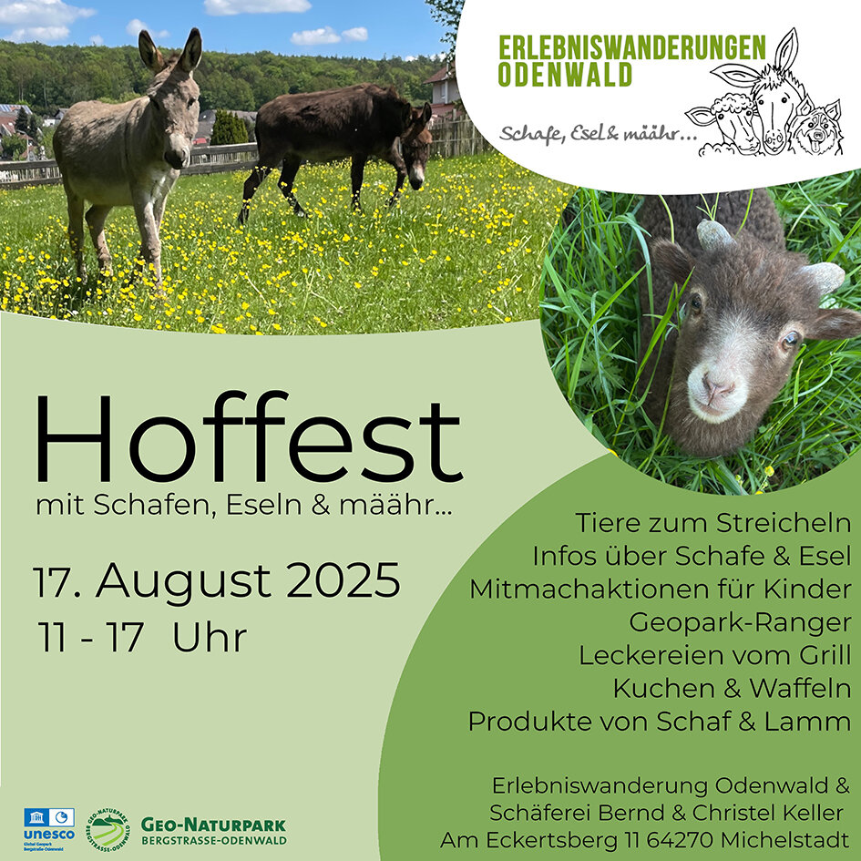 Michelstadt. Am Samstag, 17. August, findet das Hoffest der Schäferei Keller von 11 bis 17 Uhr statt. Treffpunkt ist „Am Eckertsberg 11“ in Michelstadt-Rehbach.