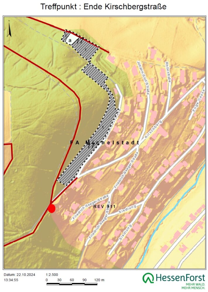 Treffpunkt ist das Ende der Straße „Kirschberg“ in Lützelbach, Ortsteil Seckmauern. Wo die Straße zum Forstweg wird, geht es zu Fuß weiter. Fahrzeuge können entlang der Straße Kirschberg und Waldhausstraße im Wohngebiet geparkt werden.