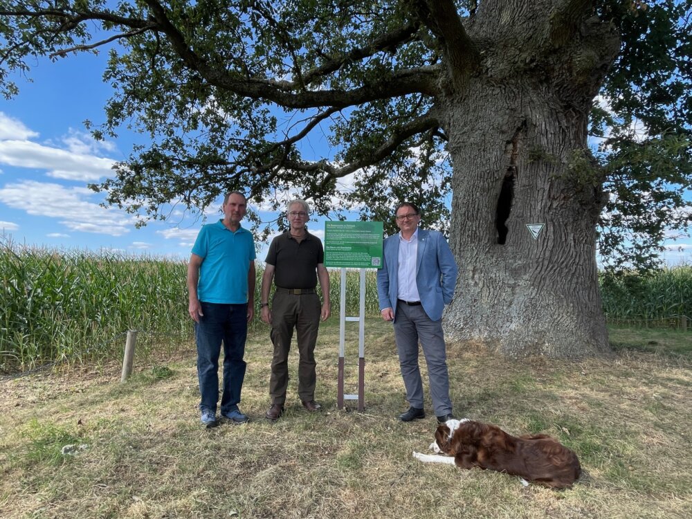 Um Besucher über die Geschichte der Eiche zu informieren, hat der Ortsbeirat Rehbach nun eine Infotafel mit Basisinformationen aufgestellt. Weitere Details und Fotos sind über einen QR-Code auf der Tafel abrufbar. red
