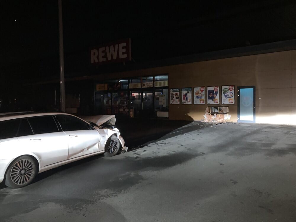 Die Testfahrt endete in der Supermarktfront. Die Wucht des Aufpralls war so groß, dass die Wand zur Kundentoilette durchbrochen wurde.