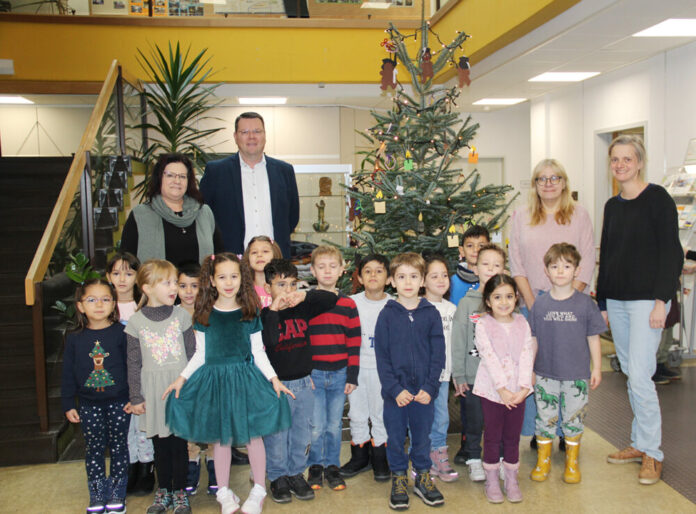 Bürgermeister Jens Fröhlich bedankte sich bei den Kindern und Erzieherinnen der Kindertagesstätte Hetschbach für die Dekoration des Weihnachtsbaumes im Rathaus und lud die Kinder zu einem kleinen Umtrunk und Weihnachtsgebäck ein. red