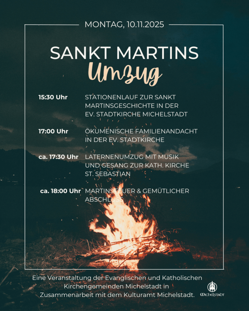 Michelstadt. Am Montag, 10. November, lädt die Stadt zum traditionellen Sankt Martinsumzug ein. Beginn ist um 17 Uhr mit einer ökumenischen Familienandacht in der Evangelischen Stadtkirche. Anschließend zieht der festlich beleuchtete Laternenumzug mit Musik und Gesang durch die Straßen bis zur Katholischen Kirche St. Sebastian. Dort erwartet die Teilnehmer ein wärmendes Martinsfeuer und ein stimmungsvoller Abschluss in geselliger Atmosphäre. Der Umzug ist eine gemeinsame Veranstaltung der Evangelischen und Katholischen Kirchengemeinden Michelstadt in Kooperation mit dem Kulturamt. Alle Kinder mit Laternen, Familien und Bürger sind eingeladen, mitzufeiern und die Tradition des Teilens und Lichts gemeinsam zu erleben. red